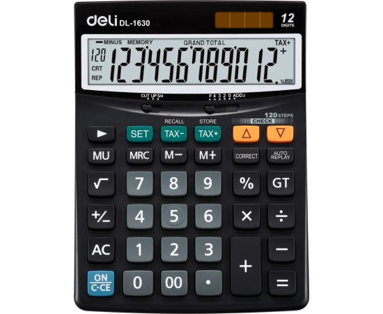 Калькулятор настольный, E1630, 188x140 мм, черныйБухгалтерский калькулятор Deli 1630 настольный в пластиковом корпусе с 12-разрядным ЖК-дисплеем. Имеет оптимальный набор вычислительных функций: основные математические операции, расчет процентов, извлечение квадратного корня, запоминание промежуточных результатов, вычисление налога и наценки. Позволяет корректировать введенное число. Удобная клавиатура снабжена кнопкой ввода двойного нуля. В калькуляторе имеется два источника питания. Размеры: 188х140х44 мм. В комплекте 1 батарейка LR44. 2VTB13