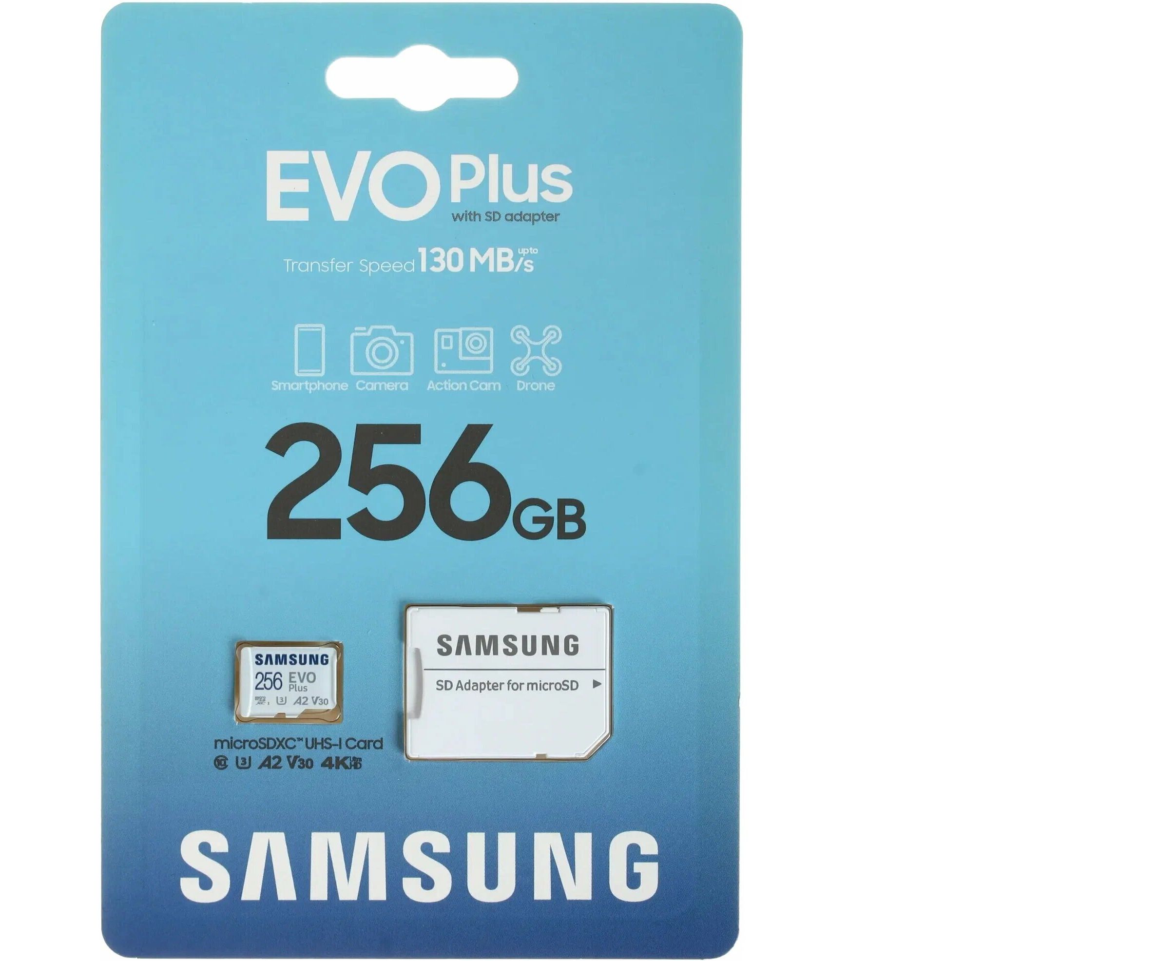 Карта памяти Samsung Evo Plus Class 10 (MB-ME256KA/AM), microSDXC 256GB A2, V30, UHS-I (U3), W 90 МБ/с, R 130 МБ/с, адаптер на SD