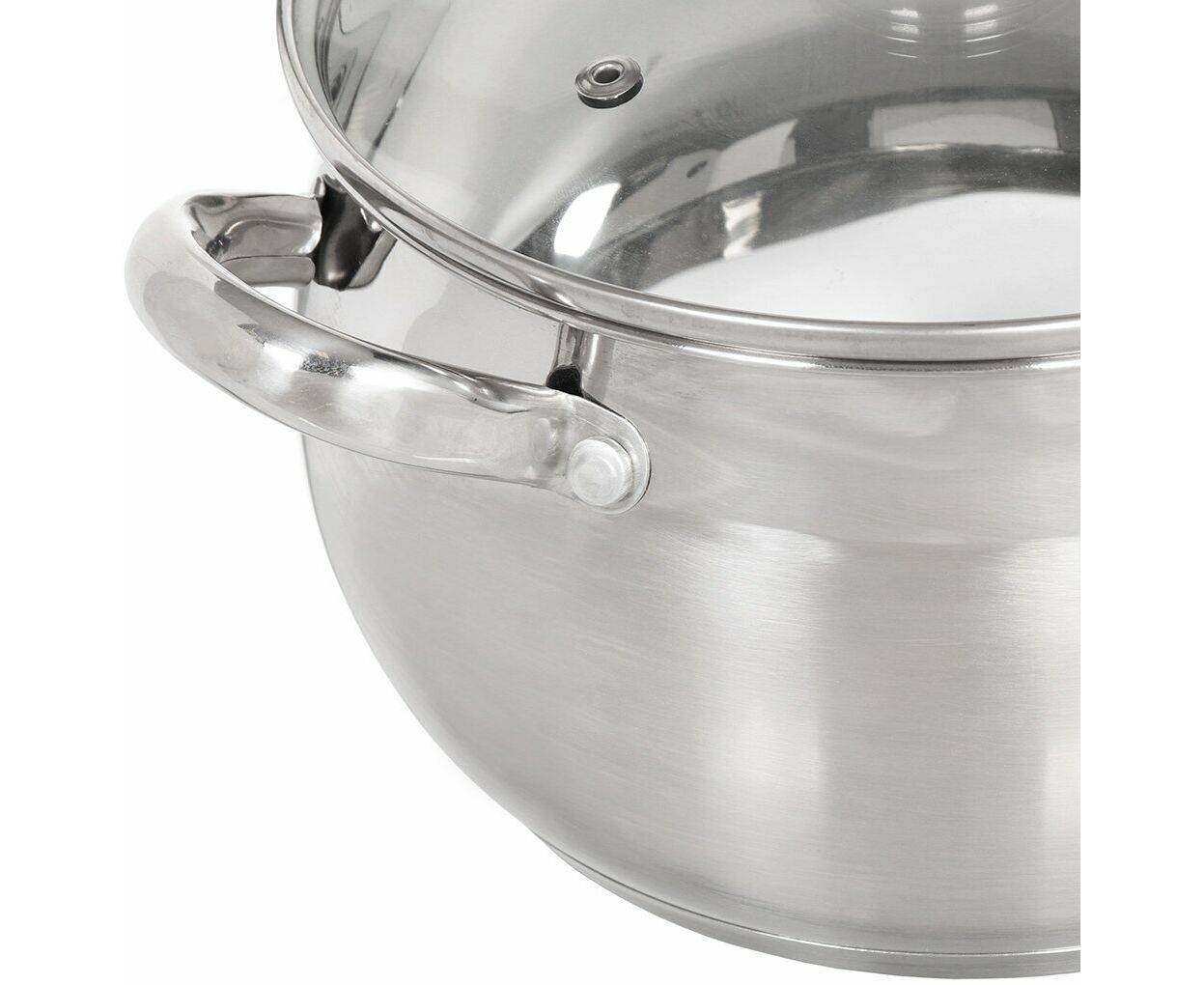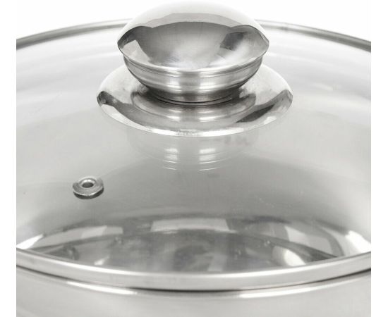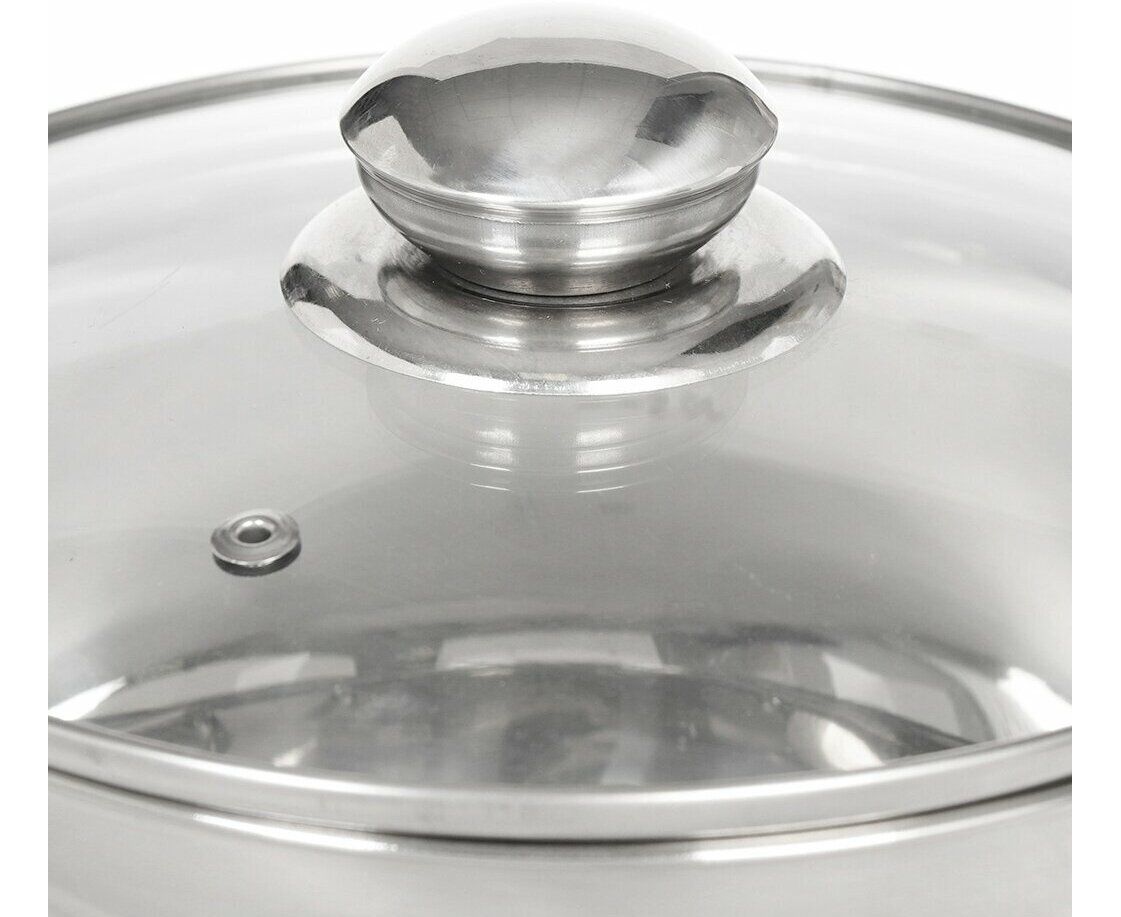 Крышка стеклянная, с клапаном выпуска пара. Посуда совместима с разными видами варочных поверхностей, в том числе с индукционной.