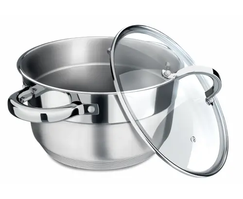 Удобство эксплуатации обеспечивают полые дугообразные ручки с зеркальной полировкой на надежных заклепках. Крышка из закаленного стекла с паровыпуском.