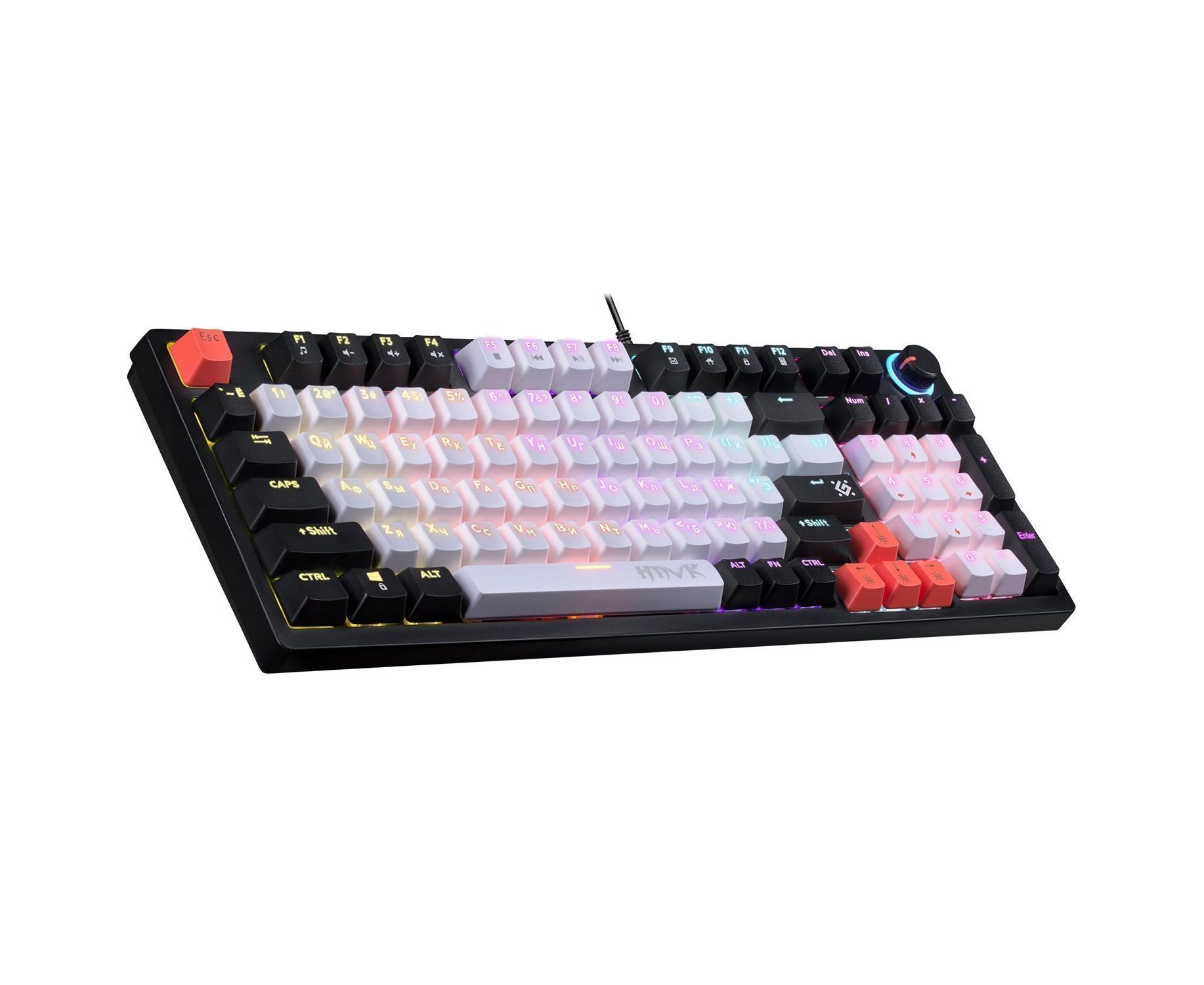Стильная механическая клавиатура с кейкапами трех цветов и тихими коричневыми свитчами. Главные особенности модели: радужная подсветка, возможность замены свитчей, благодаря технологии Hot Swap, а также наличие кнопки-регулятора для управления громкостью и подсветкой.