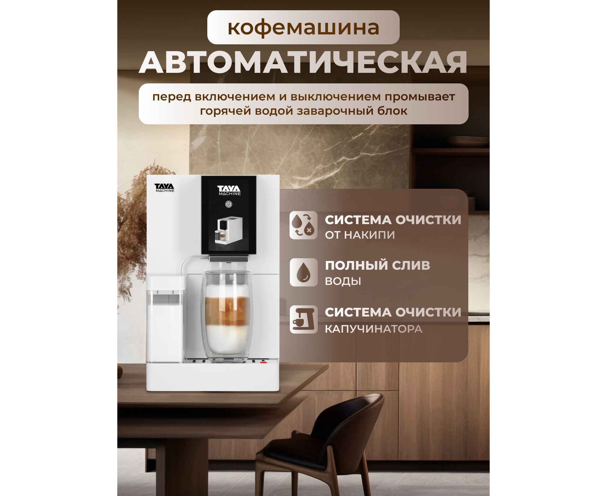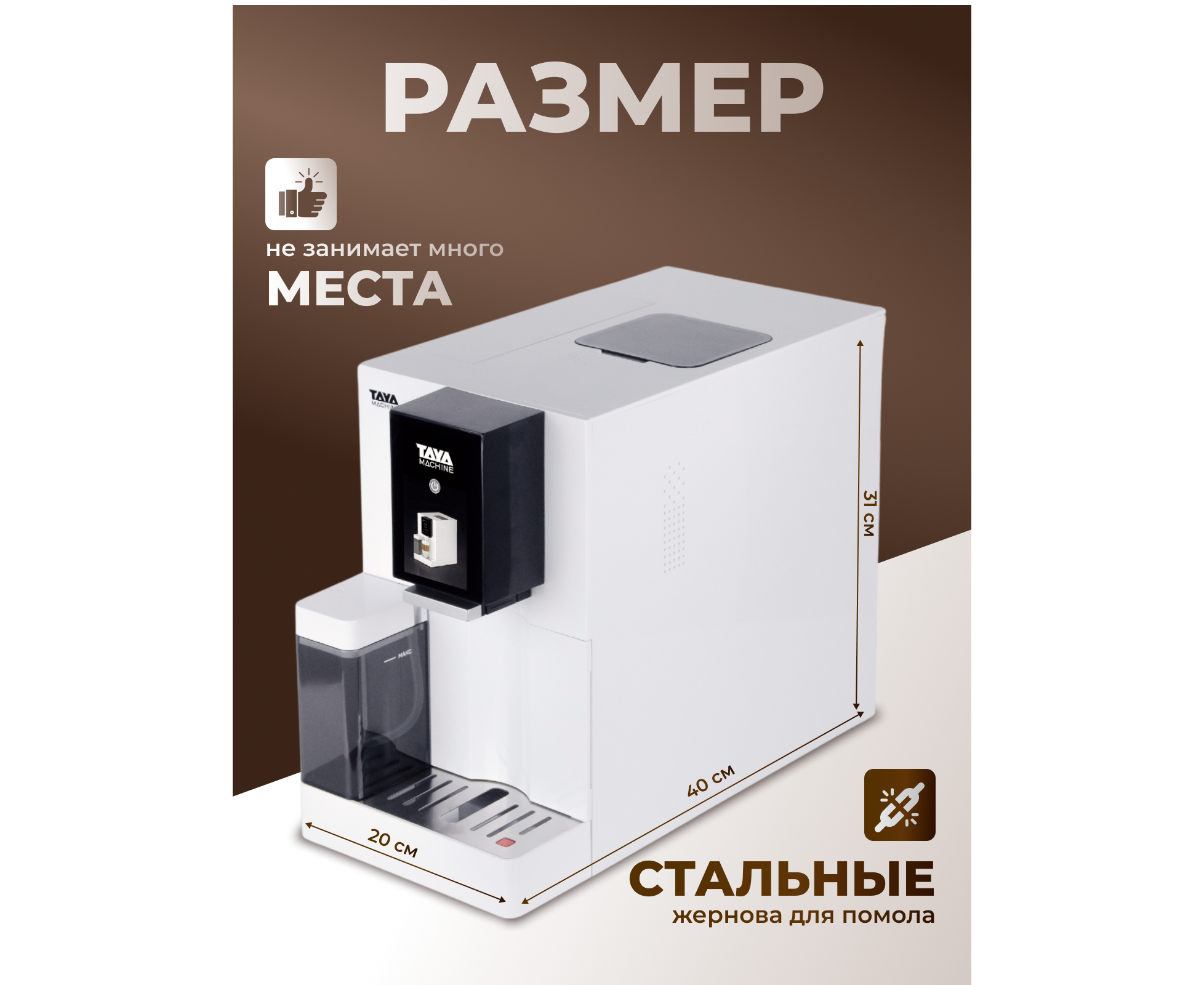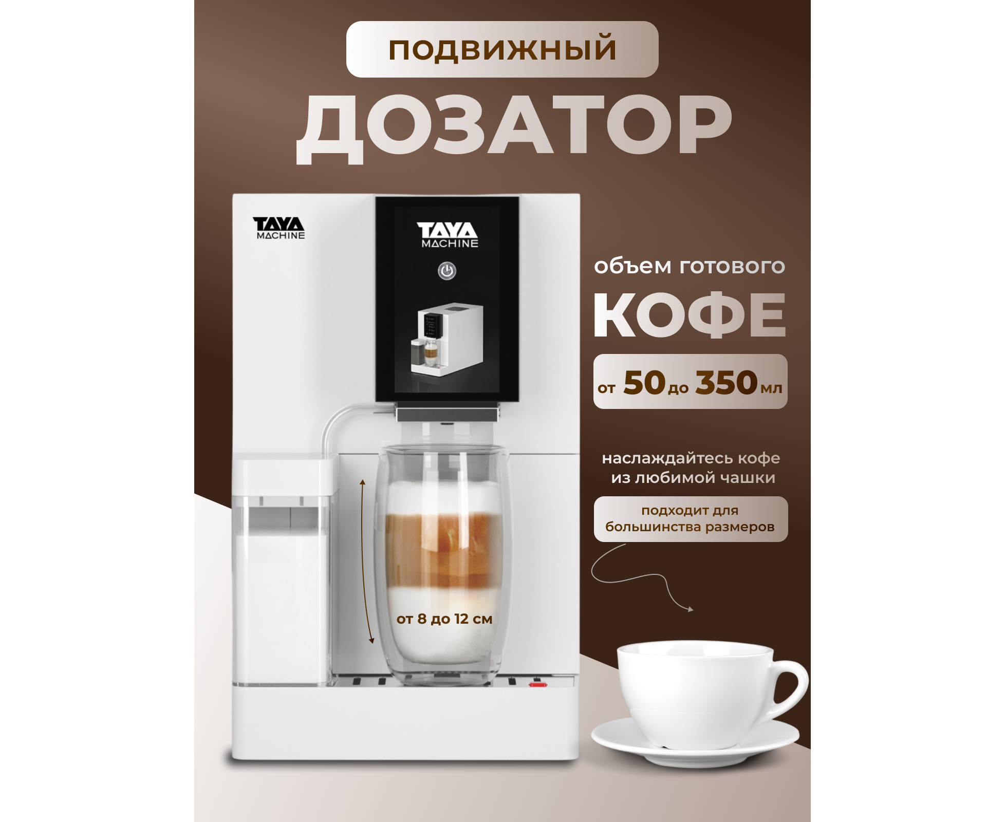 Автоматический капучинатор, позволит вам с легкостью приготовить идеальную плотную молочную пенку для капучино, латте и других напитков с молоком. Выберите объем напитка и сохраните свои предпочтения в памяти кофемашины, чтобы наслаждаться чашкой любого размера, в то время как TAYA machine R5 автоматически приготовит вашу идеальную порцию кофе.