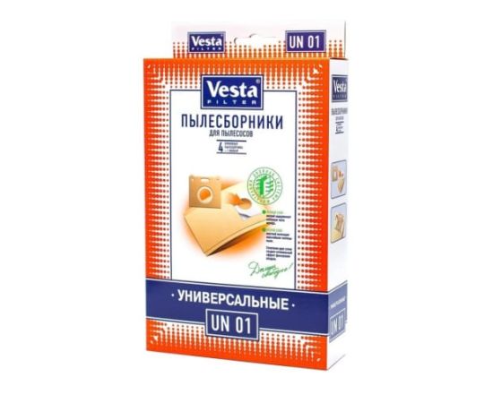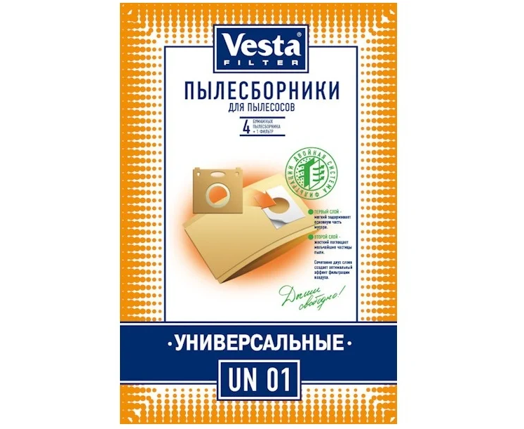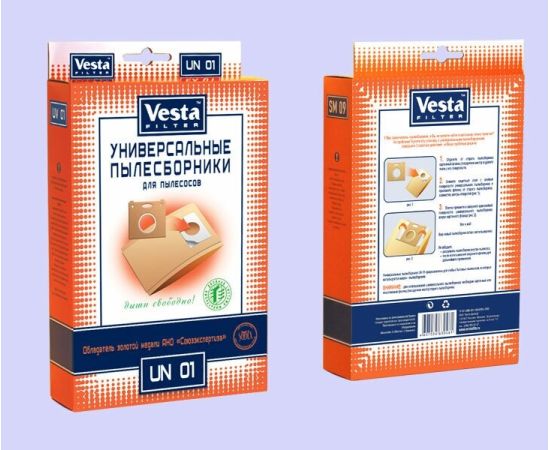 Мешки для пылесосов VESTA FILTER UN 01 из специальной двухслойной фильтровальной целлюлозы (бумаги) для пылесосов с мешком. Принцип использования - оторвать рамку от старого пылесборника, приклеить её на мешок из упаковки VESTA FILTER UN 01, который уже имеет клейкую основу. Мешки-пылесборники VESTA FILTER UN 01 являются двухступенчатым фильтром из экологически чистой целлюлозы. Обеспечивают максимальную безопасность Вашего пылесоса и чистоту воздуха в помещении.