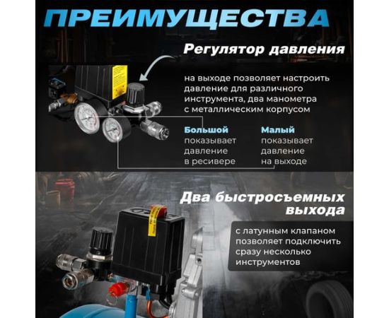 Манометр давления в ресивере и на выходе позволяет контролировать и регулировать давление сжатого воздуха. Регулятор давления позволяет настроить и поддерживать требуемое давление воздуха в соответствии с конкретными задачами.