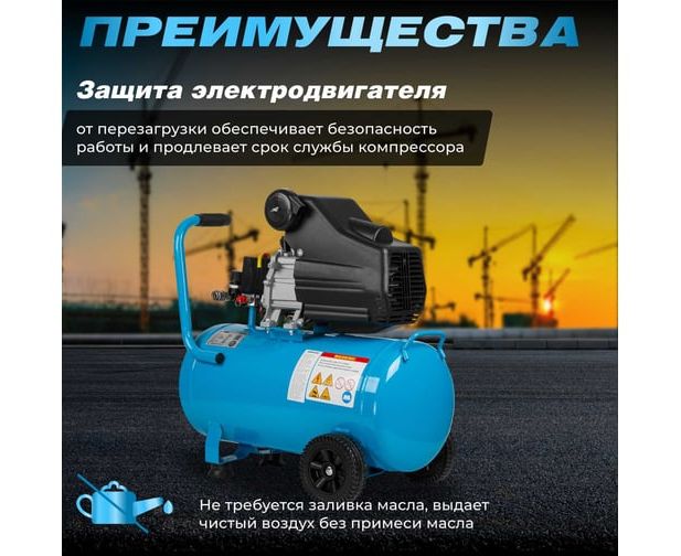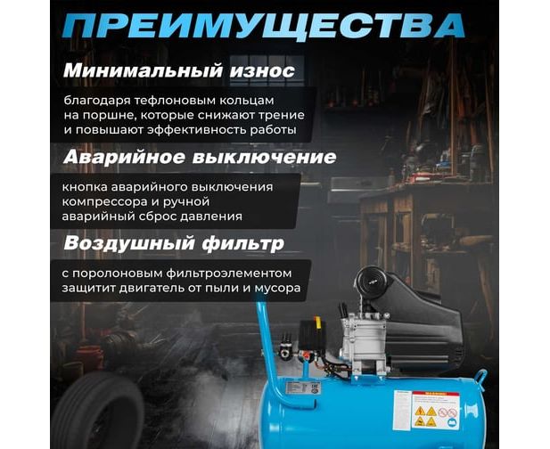 Контрольный глазок для проверки уровня масла для удобного контроля и доступа к маслу. Воздушный фильтр с поролоновым фильтроэлементом гарантирует чистоту и качество сжатого воздуха, защищая инструменты и устройства от попадания пыли и грязи. Имеется ручка для транспортировки облегчает перемещение компрессора и делает его более мобильным и удобным в использовании.