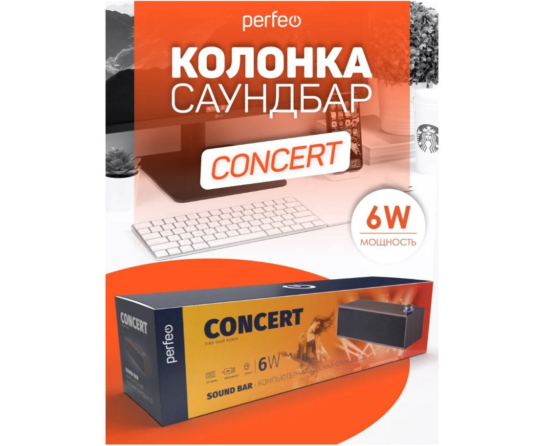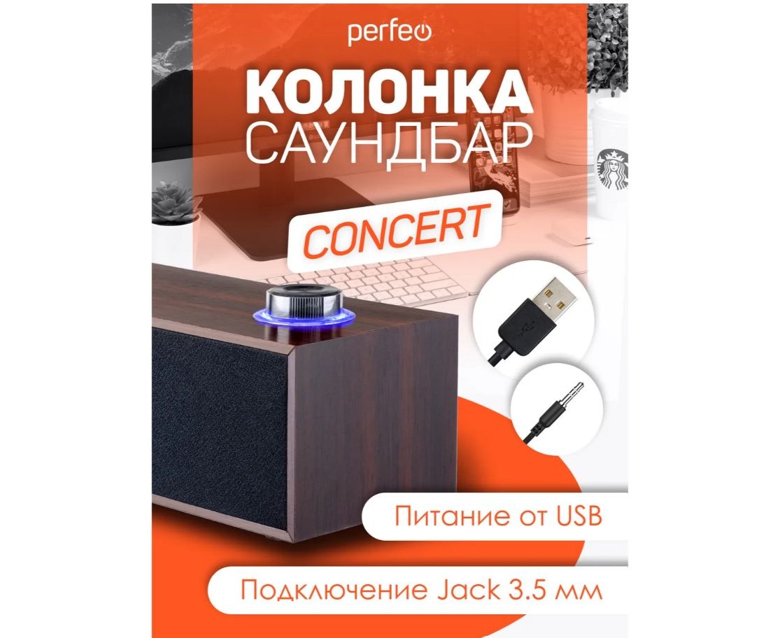 Колонка-саундбар "CONCERT" - идеально подойдёт для тех, кто работает за компьютером или ноутбуком, увлекается компьютерными играми, любит отвлечься на любимую музыку, аудиокниги, подкасты или хорошие фильмы. Подключение саундбара " CONCERT " к источникам звука осуществляется с помощью аудиокабеля с штекером Jack 3,5 мм. Питание саундбар получает через USB кабель, посредством подключения к электросети через сетевой адаптер (в комплект не входит), либо саундбар можно подключить к Power Bank'у. Саундбар "CONCERT" подарит вам яркий и насыщенный звук благодаря выходной мощности 6 Вт, а с помощью регулятора с подсветкой на верхней панели корпуса колонки очень удобно регулировать громкость звука! Корпус сделан из высококачественного МДФ с имитацией структуры дерева. Колонка "CONCERT" имеет стандартный 3.5-мм штекер с помощью которого возможно подключение практически к любому совместимому аудиоустройству. Длина USB и аудио кабеля (1,3 м) позволяет размещать саундбар там, где вам комфортно и необходимо.