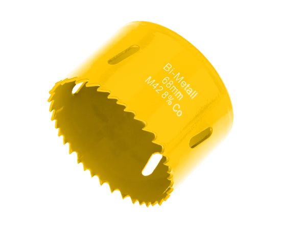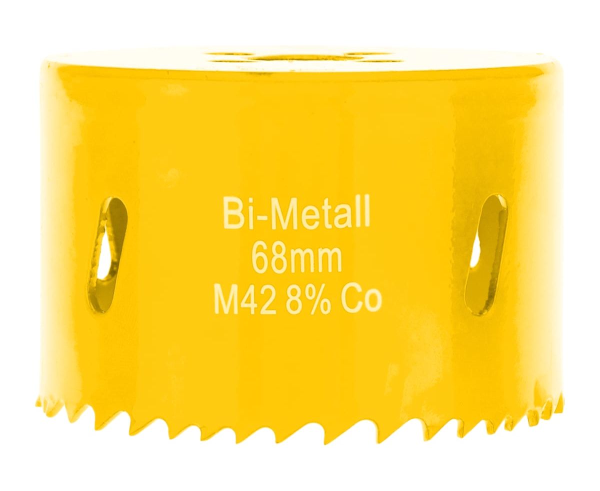 Имеет переменный шаг зубьев 4-6 мм, изготовленных из быстрорежущей стали Р6М5К8, устойчивой к нагреву. Тело коронки выполнено из инструментальной стали. Благодаря качеству используемых материалов оснастка отличается долгим ресурсом работы и высокой производительностью. Конструкция оснащена специальным отверстием в боковой стенке, которое компенсирует деформации при перегреве, отводит строительную пыль и шлам. Особая заточка зубьев способствует эффективному входу в материал, что позволяет вырезать отверстия правильной круглой формы без сколов и трещин.