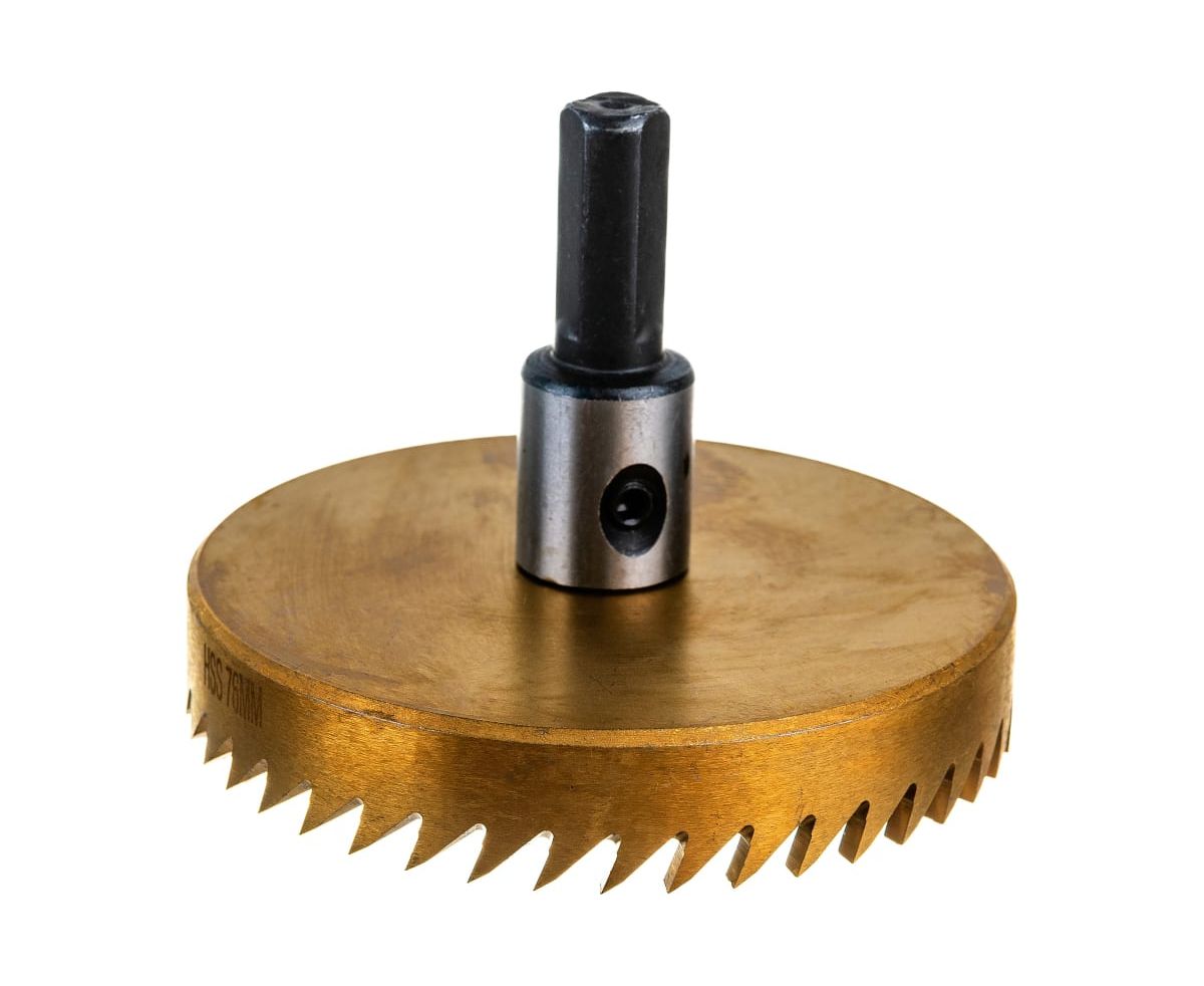 Коронка биметаллическая 76 мм с зубьями из быстрорежущей стали Р6М5. Обладает высоким ресурсом и позволяет сделать ровный и точный рез. Предназначена для резки тонколистового металла (сталь, нержавеющая сталь).