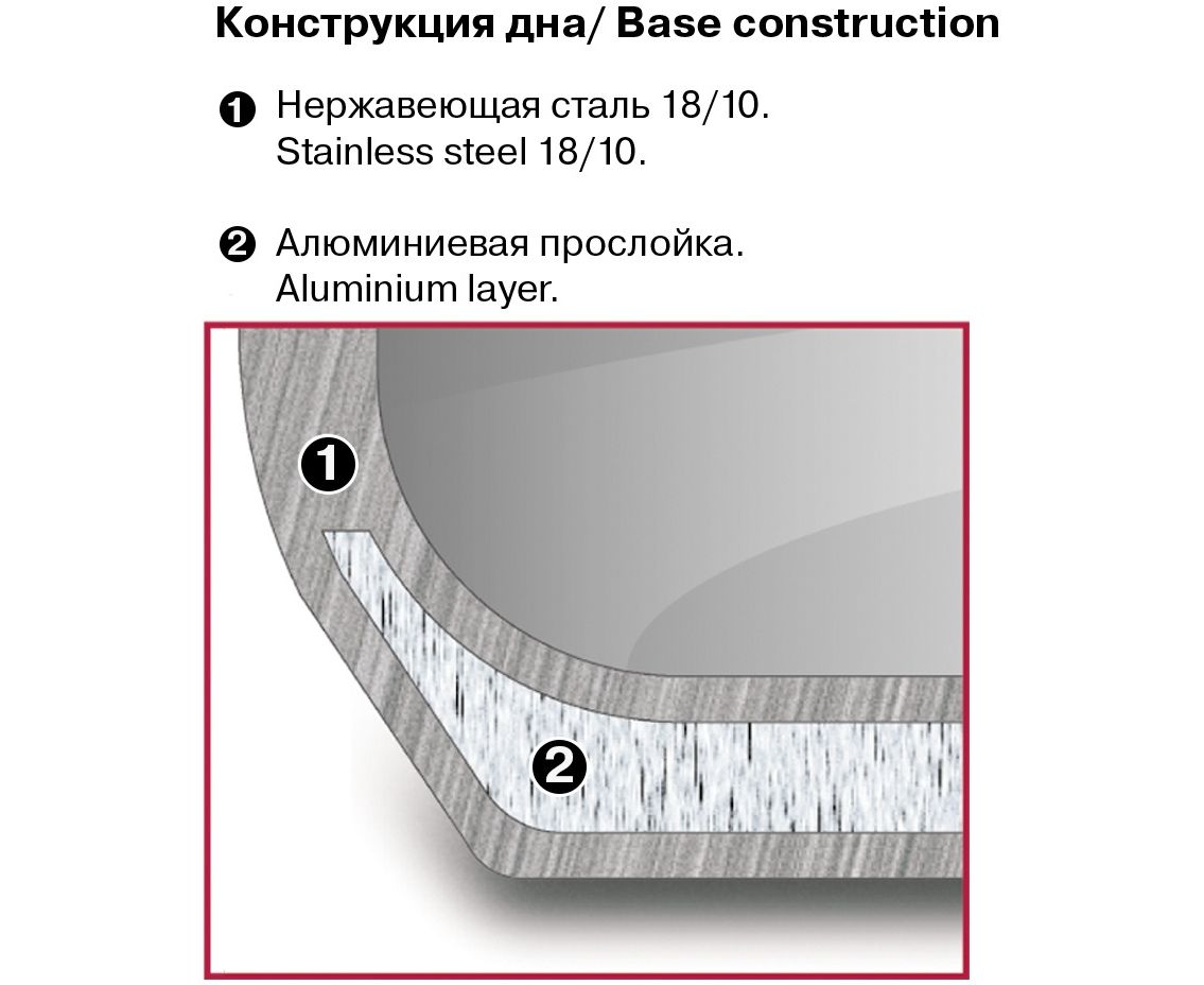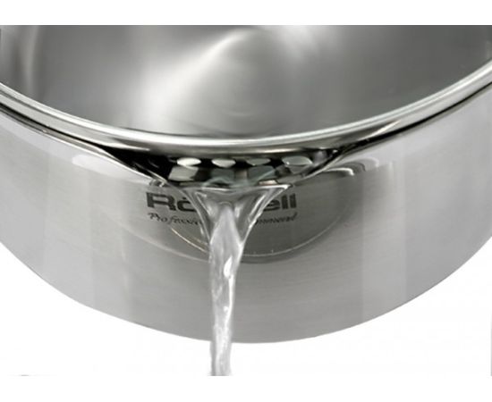 Нерж. сталь 18/10. Тройное дно без воздушных полостей. Оригинальный дизайн крышки для удобного слива жидкости без дуршлага. Ручки из бакелита с покрытием soft touch. Внутренние отметки литража. Для всех видов плит, включая индукционные