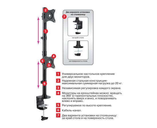 Мониторы на кронштейне можно: вращать на 360° в горизонтальной плоскости, наклонять вверх и вниз, и поворачивать влево и вправо. Кабель-канал. Два варианта установки на столешницу: за край стола и на поверхность стола.