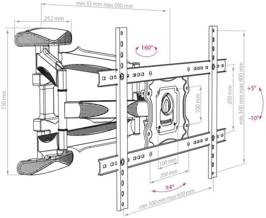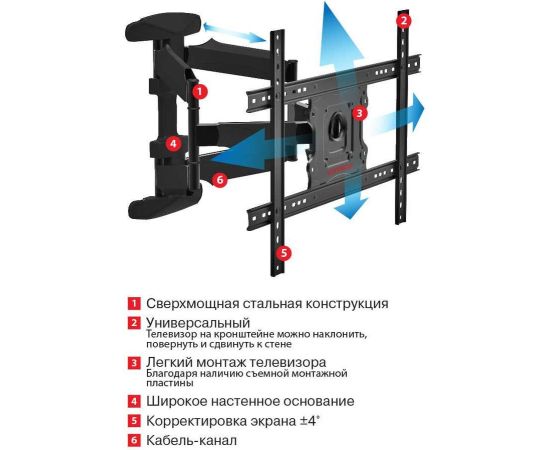 Описание Сверхмощная стальная конструкция. Универсальный — телевизор на кронштейне можно наклонить, повернуть и сдвинуть к стене. Легкий монтаж телевизора — благодаря наличию съемной монтажной пластины. Широкое настенное основание. Корректировка экрана ±4°. Кабель-канал.