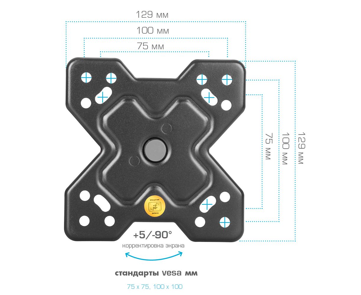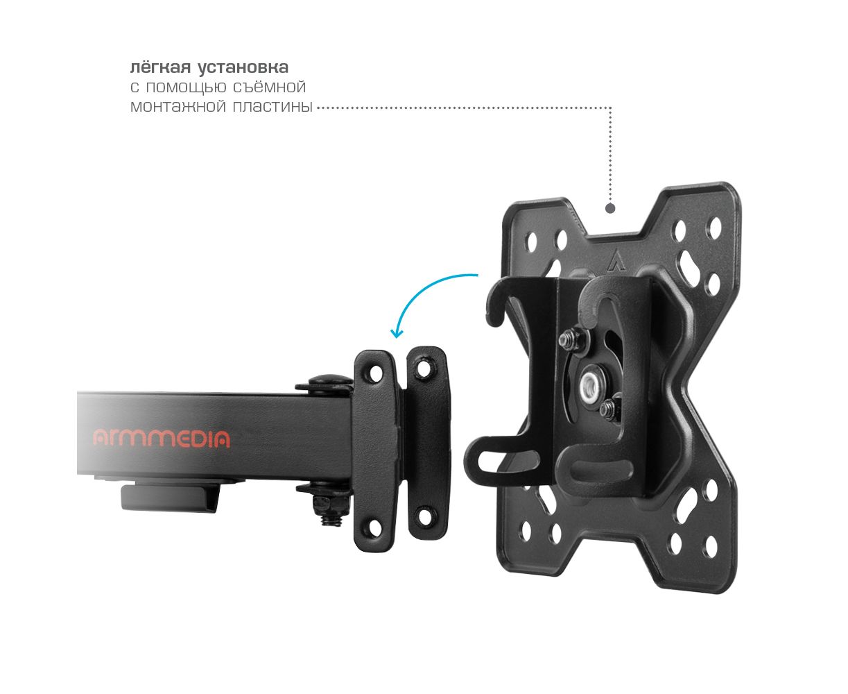 Надежная стальная конструкция, Универсальный - телевизор на кронштейне можно наклонить, повернуть и сдвинуть к стене, Легкий монтаж телевизора - благодаря наличию съемной монтажной пластины, Кабель-канал, Вращение экрана +5° -90°