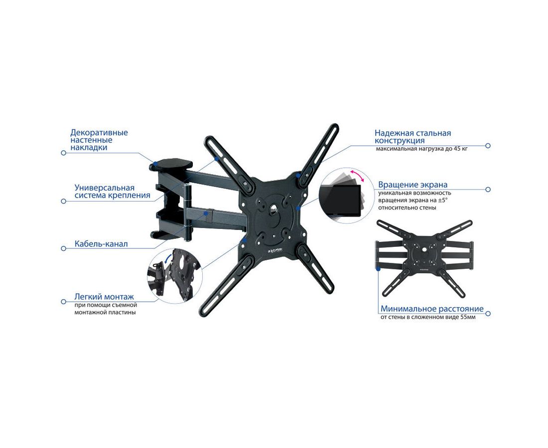 Недорогой, очень добротно сделан. Много вариантов крепления телевизоров, несколько комплектов винтов для монтажа в комплекте. Есть пара полосок на липучке для закрепления кабеля на кронштейне.