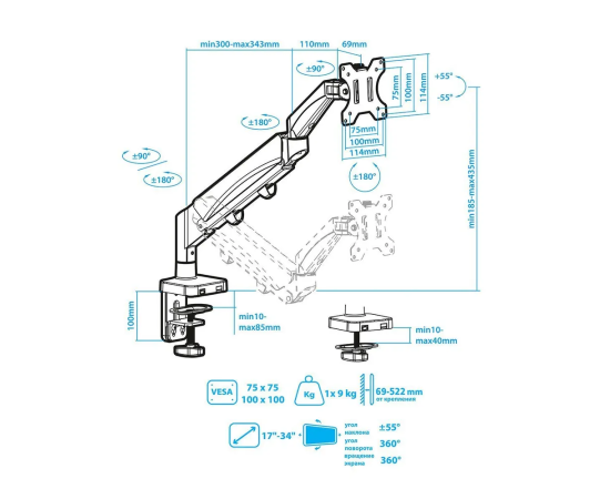 Вращение, Наклон, Поворот, Регулируемая высота