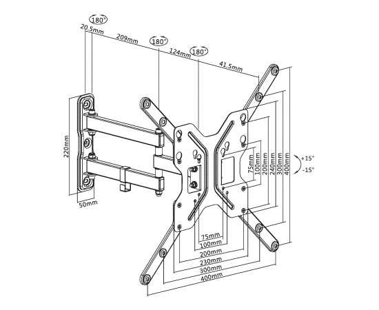 VESA: 75x75, 100x100, 200x100, 200x200, 300x300, 400x400