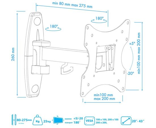 Вылет от стены/потолка: 80-275 мм