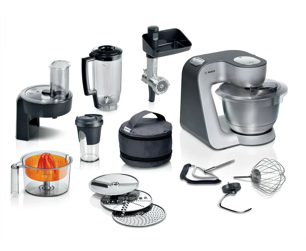 Комплектация 1 нож для измельчения, 1 чаша, 1 мясорубка, 1 металлический венчик для теста, 1 блендер, 1 вращающийся диск для измельчения, 1 диск для средней терки, 1 вращающийся режущий диск, 1 пресс для цитрусовых, 1 сумка для аксессуаров