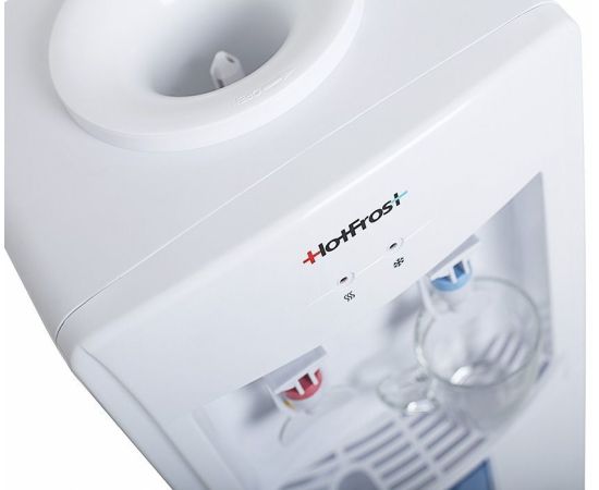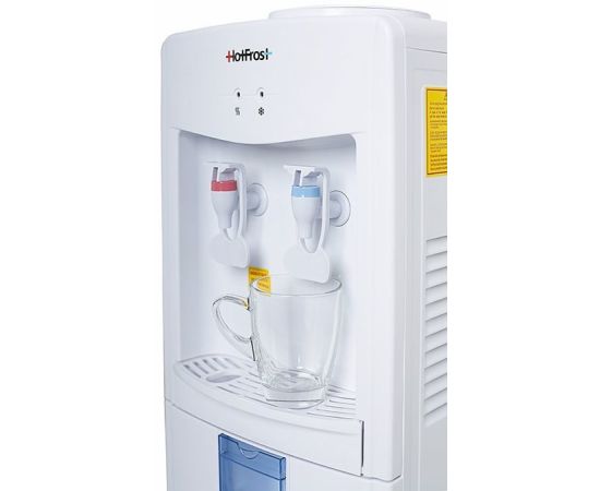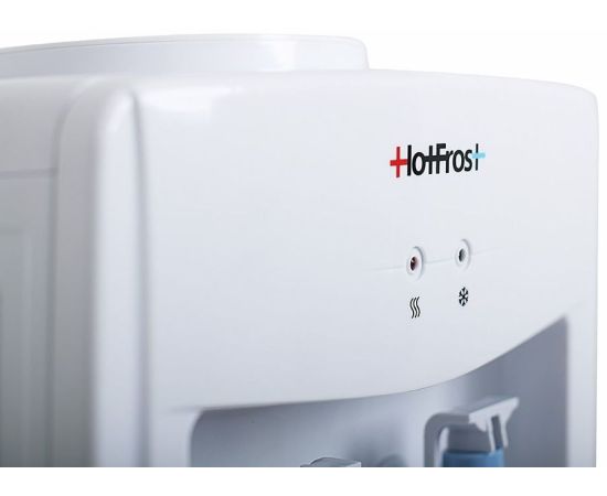 Описание: HotFrost V118E недорогой, но в то же время надежный кулер для воды. Наличие нажимных краников избавляет владельцев данной модели от излишних контактов с поверхностями кулера, что действительно очень гигиенично. Кроме этого, кулер оборудован откидным шкафчиком для хранения пластиковых стаканчиков.