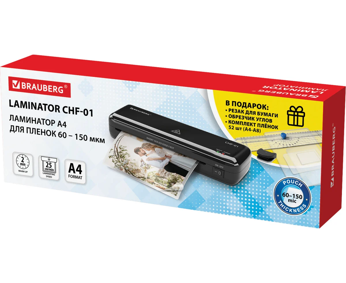 Ламинатор BRAUBERG CHF-01 отлично подойдет для работы дома и в офисе. Предназначен для ламинирования документов, меню, рисунков, фотографий. В подарок к нему вы получите стартовый набор для ламинирования: резак, обрезчик углов и 52 пленки форматов А4-А8.