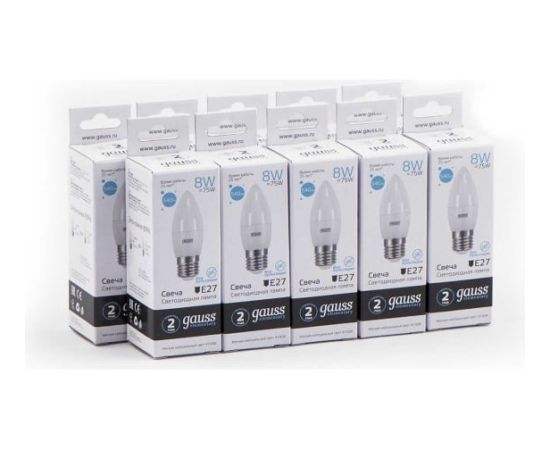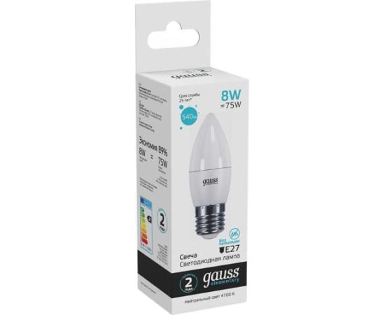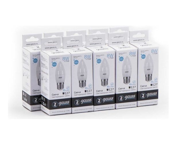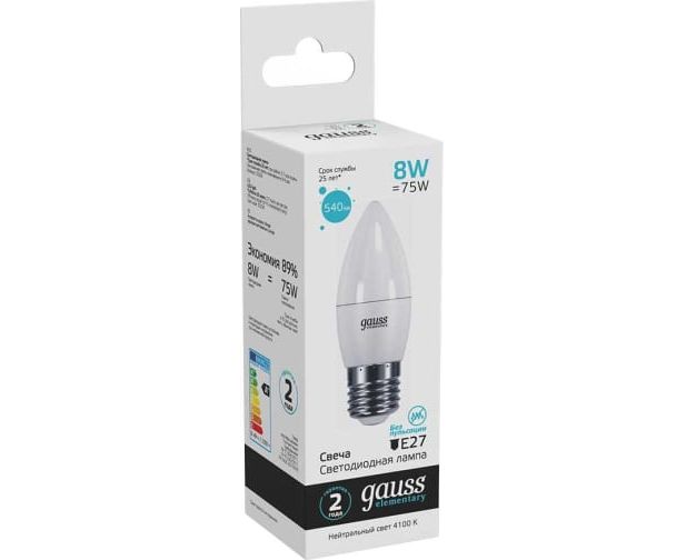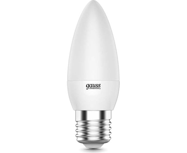 Лампа Gauss Elementary (33228) светодиодная 8Вт цок. E27 свеча 220B 4100K св.свеч.бел.нейт. C37 (упак. 10шт)