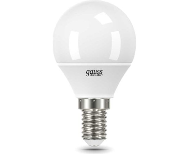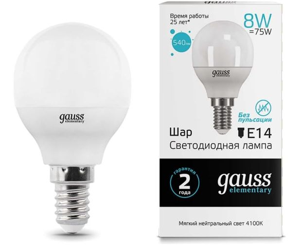 Лампа Gauss Elementary (53128) светодиодная 8Вт цок. E14 шар 220B 4100K св.свеч.бел.нейт. P45 (упак. 10шт)