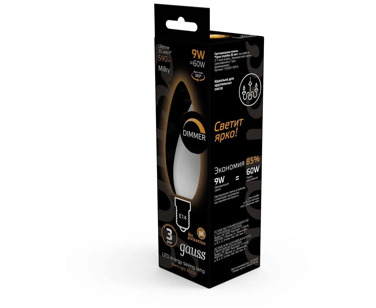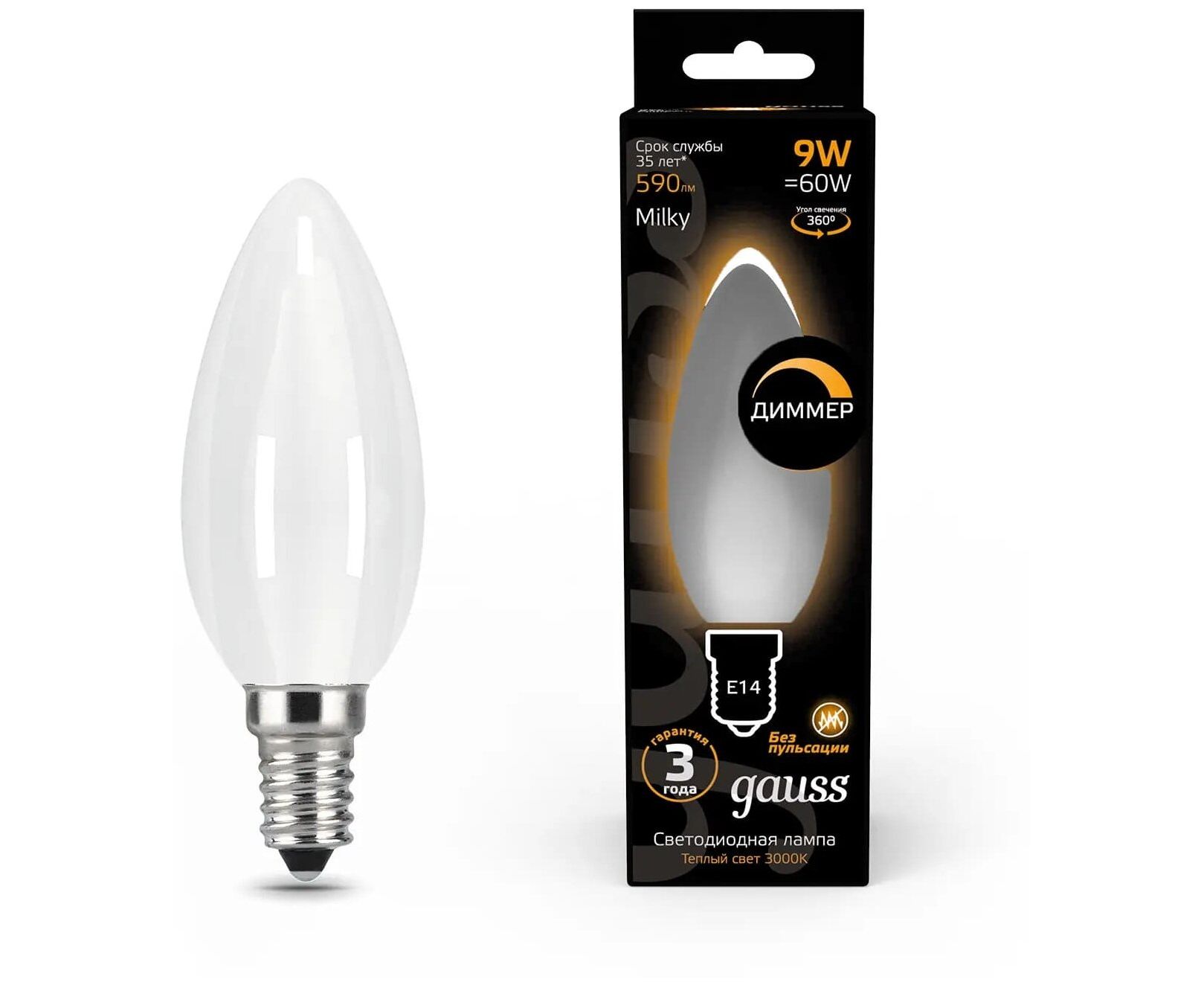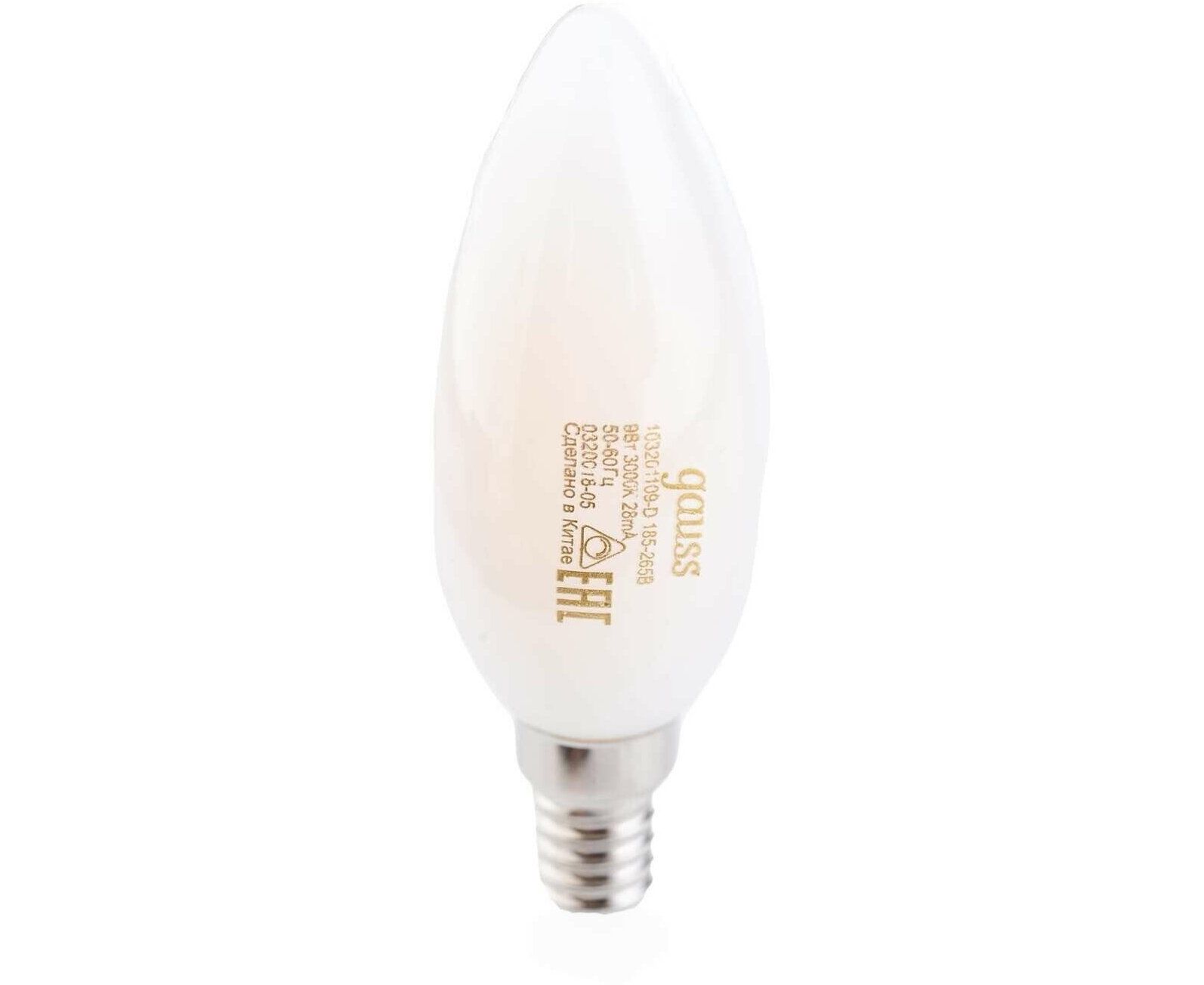 Лампа Gauss Filament (103201109-D) светодиодная 9Вт цок. E14 свеча 220B 3000K св.свеч.бел.теп. (упак. 10шт)