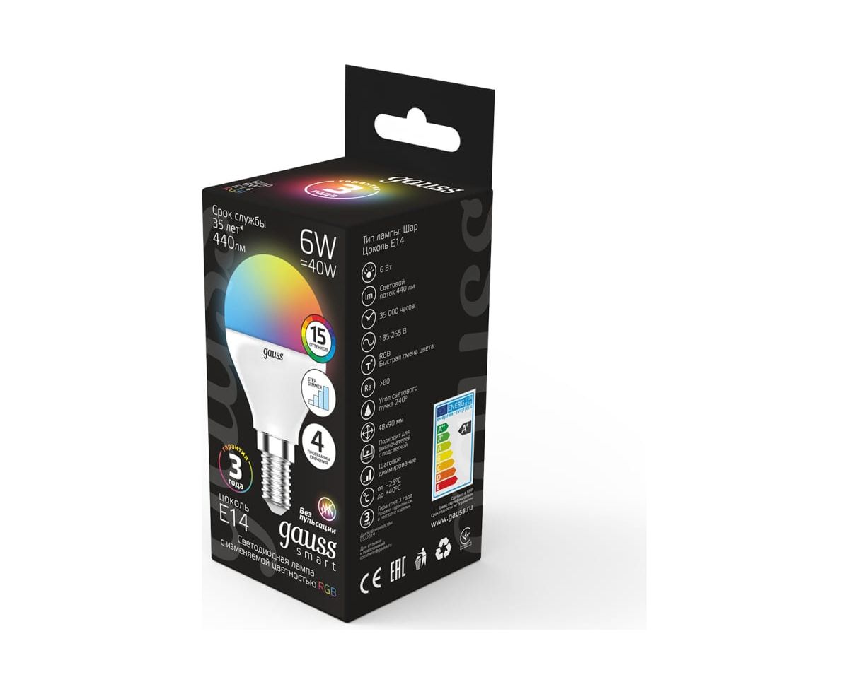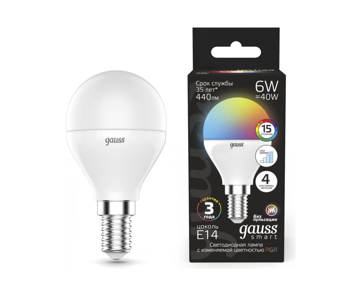Технические характеристики Gauss Smart LED, шар, G45, 6W, E14, RGBW+dim 105101406