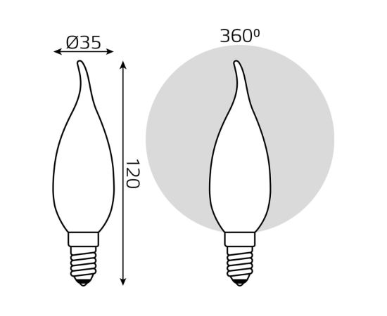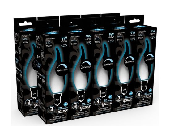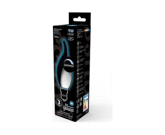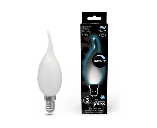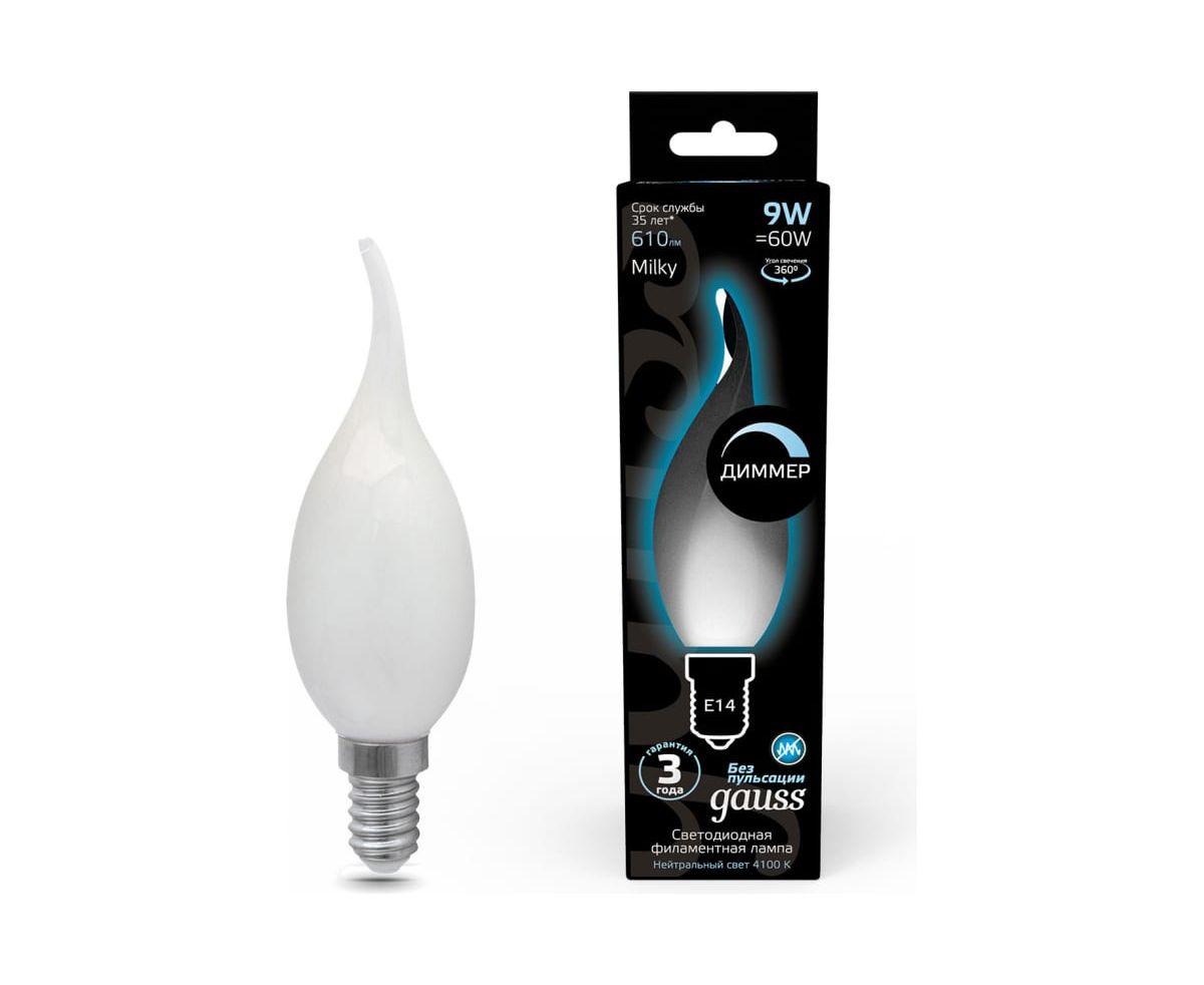Технические характеристики Gauss Filament свеча на ветру, 9W, 610lm, 4100К, Е14, milky, LED 104201209-D