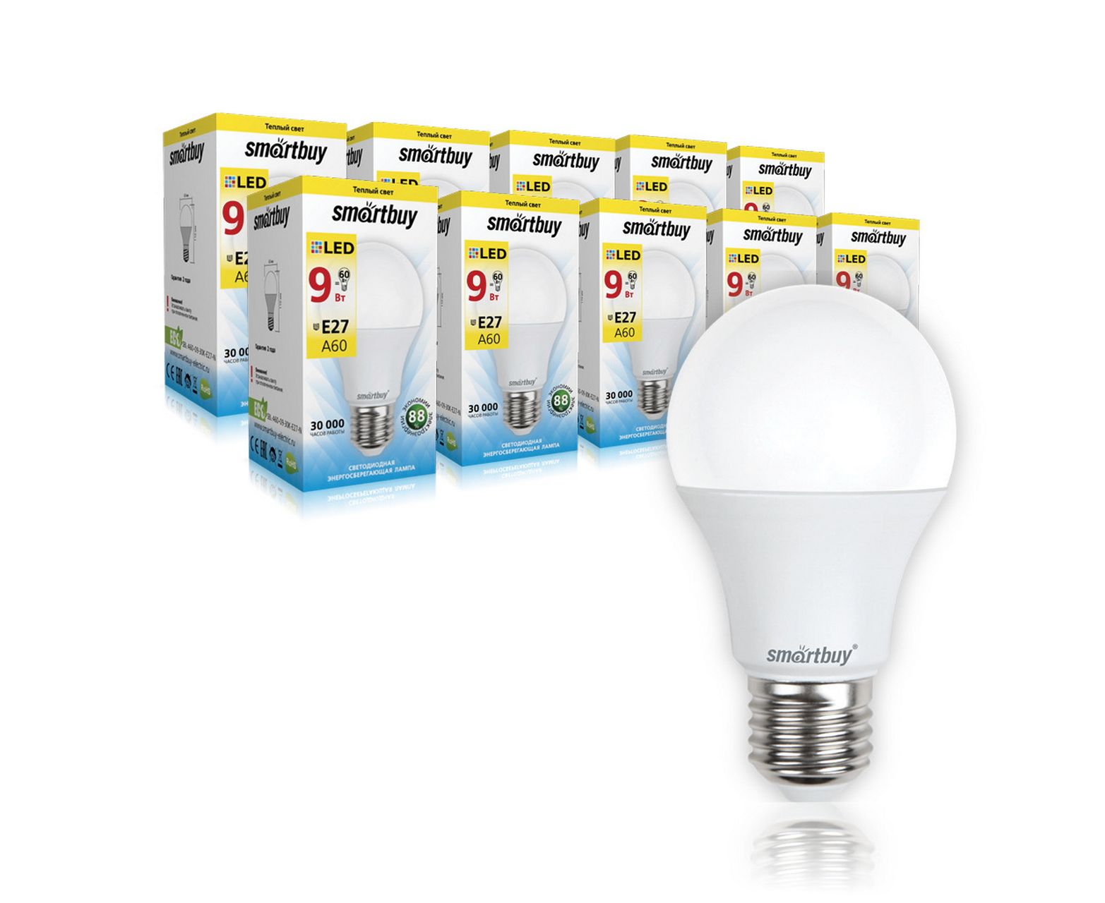 Лампа светодиодная SMARTBUY A60 9Вт 220V 3000K E27 (тёплый свет) (1/10/50)