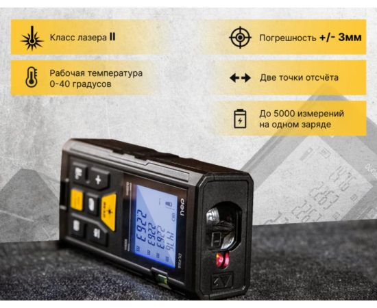 Дальномер оснащен лазером, который позволяет измерять расстояния на удалении до 40 метров с трехмиллиметровой точностью