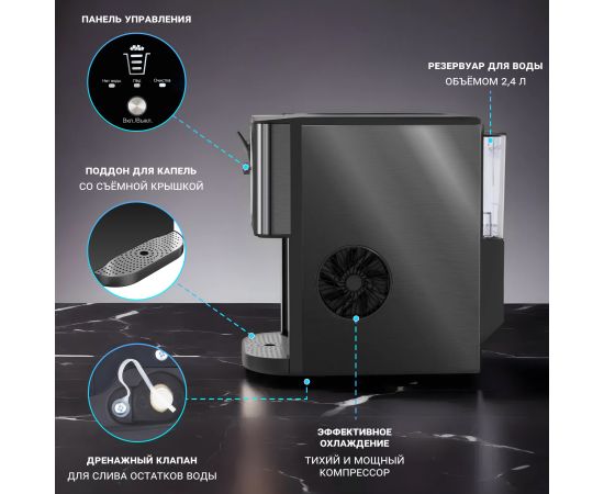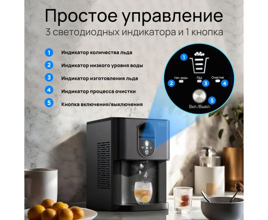 Запуск работы одной кнопкой избавит от необходимости тратить время на то, чтобы вникать в тонкости работы прибора. Удобный LED дисплей предоставит всю необходимую информацию о состоянии устройства, включая уровень заполненности льдом в режиме реального времени. Индикатор нехватки воды напомнит о необходимости наполнить резервуар.