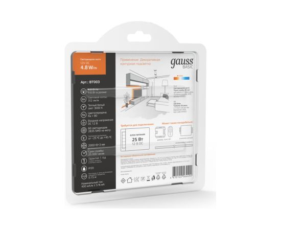 Лента Gauss Basic 12V 4,8W/m 312lm/m 3000K IP20 LED 2m BT003 способна решить ряд задач связанных как с декоративным освещением помещений, так и с экстерьерной подсветкой.