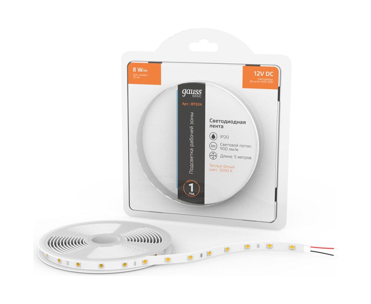 Лента Gauss Basic 12V 8W/m 900lm/m 3000K IP20 LED 5m BT024 способна решить ряд задач связанных как с декоративным освещением помещений, так и с экстерьерной подсветкой.