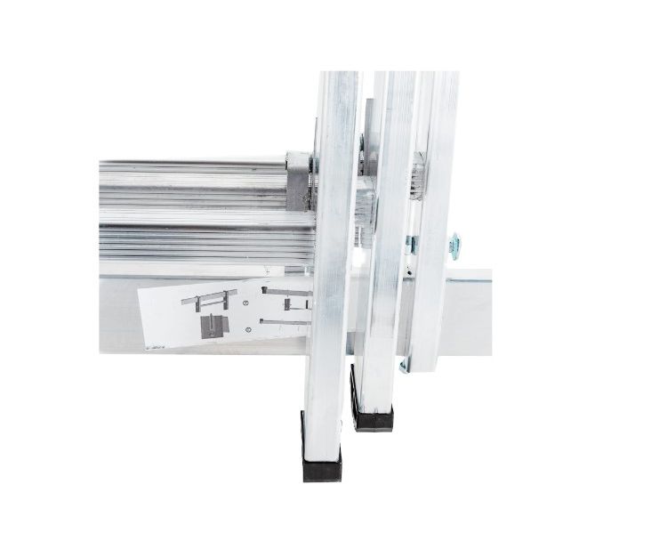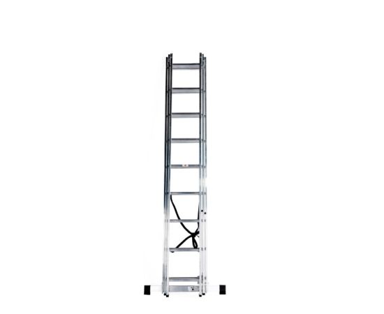 Алюминиевая трехсекционная лестница Сибртех 97819 состоит из 3-х секций по 9 ступеней каждая. Она предназначена для использования преимущественно на открытом воздухе и в помещениях с высокими потолками, подойдет также для работников коммунальных служб и строителей. Лестница поможет провести отделочные, монтажные работы, будет полезна на складе. Преимущества: Надежность и долговечность — рама изготовлена из прессованного алюминиевого профиля прямоугольного сечения, весит намного меньше стальных аналогов, при этом обладает прочностью и коррозионной стойкостью. Допустимая нагрузка 150 кг — лестница способна выдержать вес практически любого пользователя. Многофункциональность — лестница может использоваться в 3-х различных вариациях — в качестве стремянки (с двумя расставленными и одной выдвинутой вверх секцией), двухсторонней стремянки (две секции расставлены, третья демонтирована) и приставной лестницы. Пластиковые заглушки — края профиля не царапают напольное покрытие независимо от выбранного положения лестницы. Устойчивость — лестница оснащена съемным стабилизатором, выравнивающим ее положение на горизонтальных поверхностях. Безопасная эксплуатация — на ступени нанесено антискользящее покрытие, имеется ограничитель по максимальной высоте. Простое применение — сборка, разборка и смена рабочих положений не занимает много времени. Компактное хранение и удобная транспортировка — в сложенном виде лестница не занимает много места.