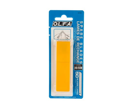 Сегментированные лезвия OLFA OL-AB-50B являются запасными элементами для ножа. Изготовлены по специальной технологии с использованием многошагового процесса доводки, имеют двойной угол заточки. Состоят из 13 сегментов, каждый из которых имеет свою режущую кромку, поэтому, обломив затупившийся сегмент, можно продолжить работу острым лезвием без перезатачивания. Ножом с таким лезвием легко и удобно разрезать бумагу, обои, картон, веревки, срезать строительно-монтажную пену. Поставляются в пластиковом пенале.