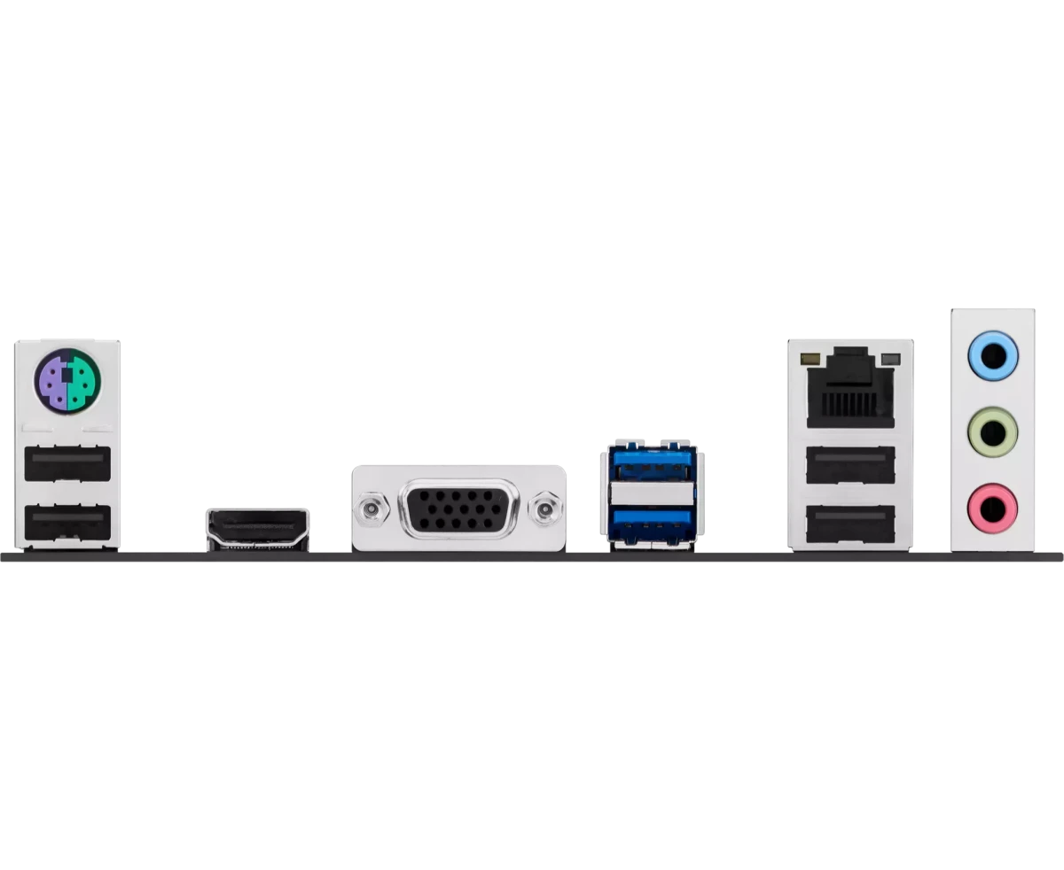 PS/2, 4 x USB 2.0, 2 x USB 3.2 Gen1, VGA, HDMI, RJ-45