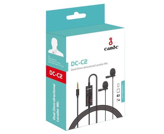 Candc DC-C2 – универсальная микрофон, который подойдет для записи интервью, обзоров и мастер классов, где особенно важно качество звука. Он записывает звук с любого направления без посторонних шумов и помех. В данной модели используется конденсаторный тип микрофона, который отличается высоким соотношением сигнала к шуму, широким динамическим диапазоном и равномерной частотной характеристикой. Может работать в тандеме со смартфонами, DSLR-фотоаппаратами, камерами, компьютерами и другими записывающими устройствами. Производитель положил к нему в коробку: батарейку, два крепления для фиксации микрофона на одежде, две поролоновые накладки для ветрозащиты и чехол для удобного хранения.Особенности и преимущества двойного петличного микрофона Candc DC-C2КонструкцияCandc DC-C2 состоит из двух всенаправленных микрофонов и блока питания. Длины кабеля достаточно, чтобы оператор смог удалиться на достаточное расстояние от снимаемого объекта, а собеседники могли удобно расположиться перед камерой.ЗвукОба микрофона принадлежат к конденсаторному типу и записывают звук, отличающийся хорошей детализацией. Частотного диапазона от 65 до 18 кГц хватает для записи человеческого голоса отличного качества.Блок питанияРаботает комплект микрофонов от батарейки типа LR44. Перед тем, как использовать его первый раз, установите ее в блок питания.УправлениеНа корпусе источника питания присутствует многофункциональная кнопка для переключения режима работы микрофона. Когда он работает со смартфоном, то она должна находиться в положении Smartphone. Режим Camera включается, когда микрофон работает совместно с камерой.Дополнительные аксессуарыВ коробку к Candc DC-C2 вложены: сумка на завязках, крепление на одежду, поролоновая насадка, которая препятствует попаданию воздуха на микрофон при слишком эмоциональной речи или сильных порывах ветра, а также переходник Jack 6.3 для подключения микрофона к таким аудиоустройствам, как микшерный пульт.Широкое применениеУниверсальный всенаправленный микрофон подойдет для записи звука во время съемок интервью, презентаций, подкастов, веб-трансляций и любых других ситуаций. Длины кабеля микрофона хватит, чтобы отойти от камеры на достаточное удаление и уместить в кадр все необходимые детали.