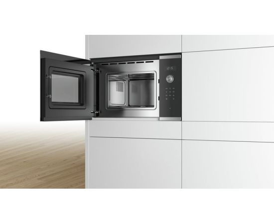 Встраиваемая микроволновая печь Bosch BFL524MS0 – современный агрегат, выполненный из нержавеющей стали, который не занимает много места, зато станет незаменимым помощником на кухне. Объем камеры, также покрытой внутри экологически безопасной нержавейкой, составляет 20 л. Выглядит эстетично, легко поддается очистке. Здесь можно подогреть любое блюдо, разморозить продукты, выбрать программу готовки – внутреннее пространство прогревается быстро и равномерно.