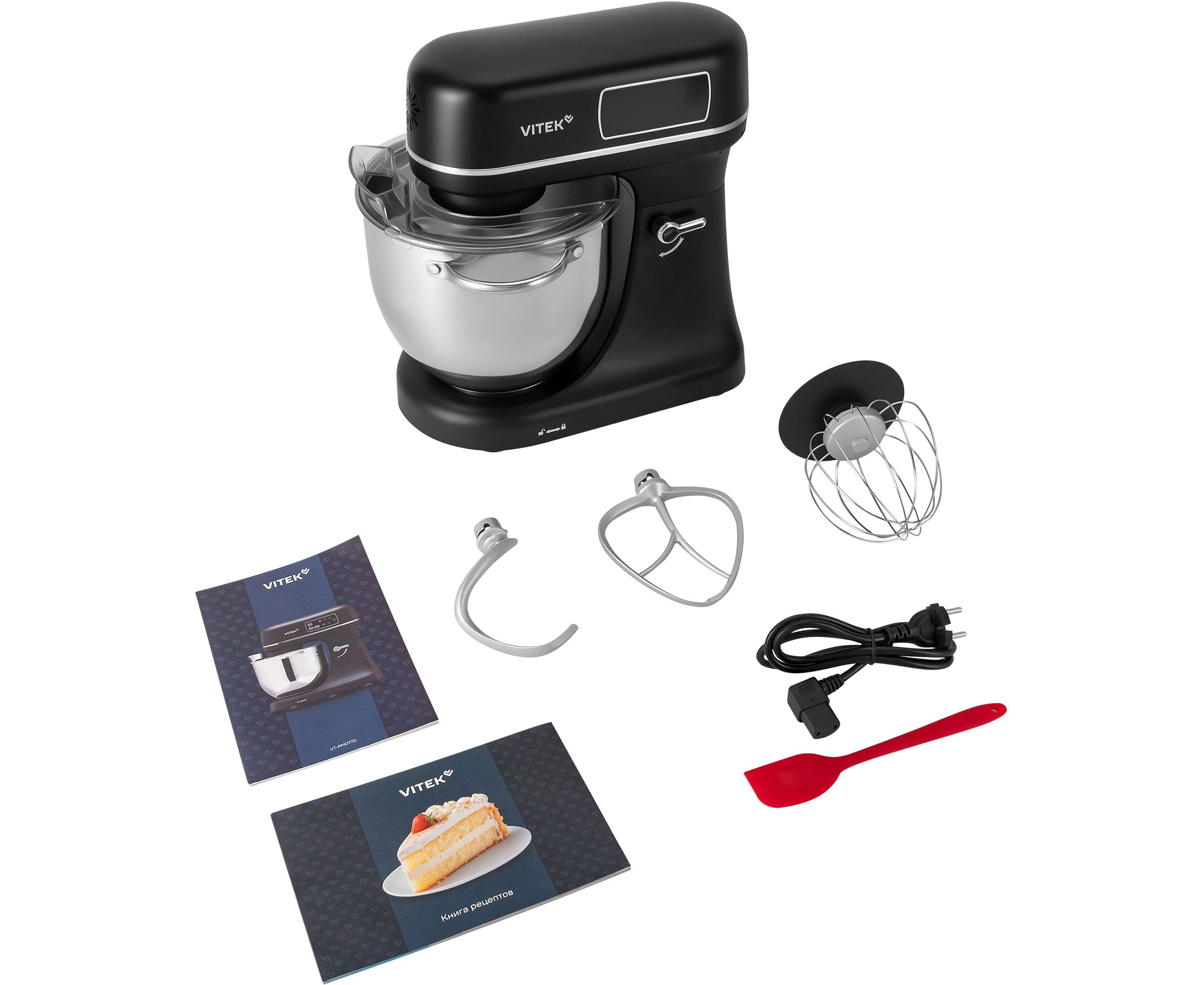 Миксер, чаша, защитный обод, насадка-венчик, насадка-крюк, насадка-лопатка, кулинарная силиконовая лопатка, книга рецептов, инструкция