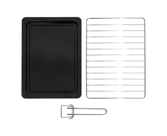электропечь, металлическая решетка, плоский противень, круглая форма для пиццы, ухват для противня, вертел, ухват для вертела, инструкция на русском языке