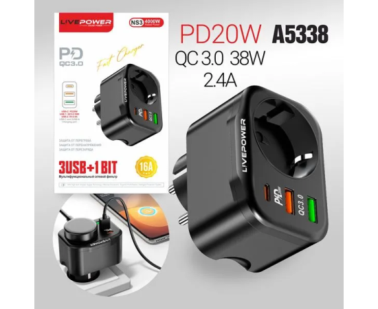 Многофункциональный сетевой фильтр Live-Power NS3 3USB+1 розетка (QC3.0+PD20W) 38W black