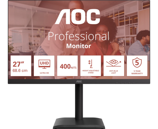 Монитор AOC U27E4CV Black 4K, IPS, 3840x2160, 60Hz, 4 ms, 178гр./178гр., 400 cd/m, +2xHDMI 2.0, +DisplayPort 1.4, DP Out, USB, USB-C, LAN, SPK