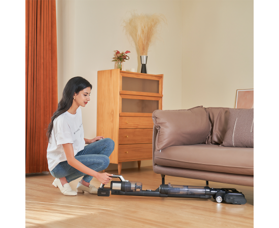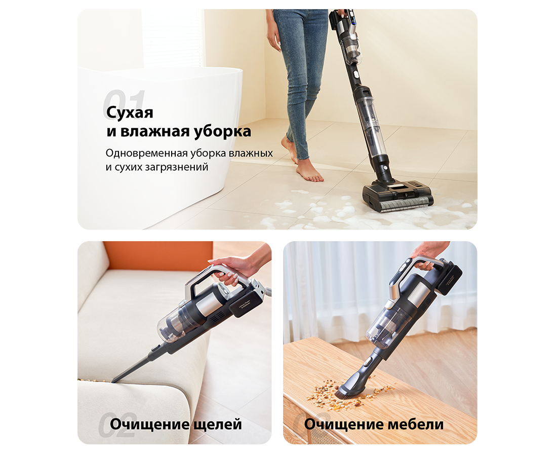 Одно нажатие кнопки позволяет переключиться с вертикального моющего пылесоса на портативный пылесос с ручным управлением. Благодаря множеству аксессуаров в комплекте можно легко очищать пол, кровать, диван и многое другое.