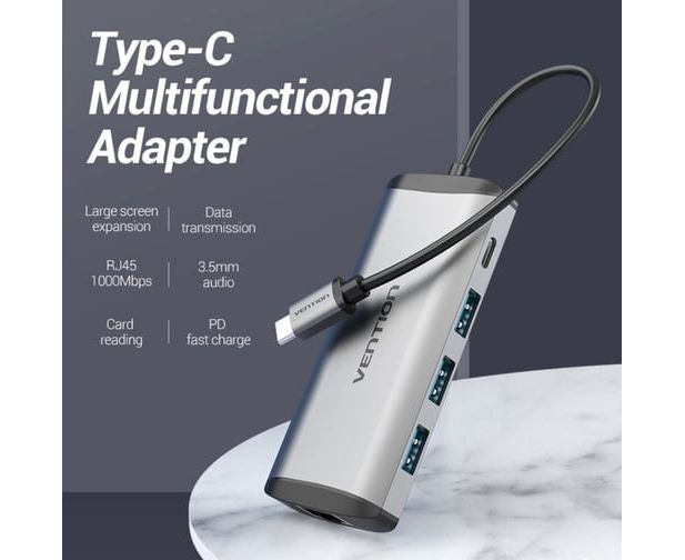 Мультифункциональный хаб Vention THAHB USB Type C 9 в 1 Type-C M/HDMI F+USB 3.0+TF F+SD F+RJ45+mini jack 3.5 mm F