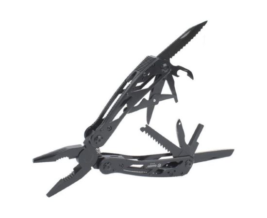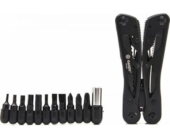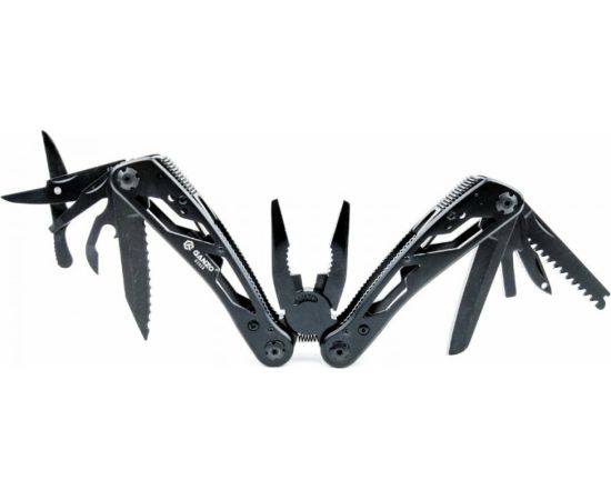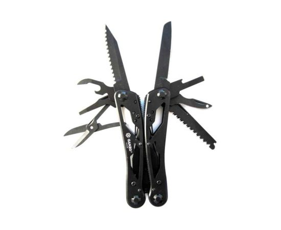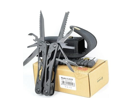 Стильный мультитул G202B от компании Ganzo. Модель имеет продуманный дизайн и большой набор инструментов. В комплект входят следующие предметы: подпружиненные плоскогубцы с кусачками, два лезвия, одно из которых имеет серрейторную заточку, плоская отвертка небольшого размера, ножницы, ножовка по дереву, зенковка, удлинитель адаптера для бит открывалки для бутылок и консервов.