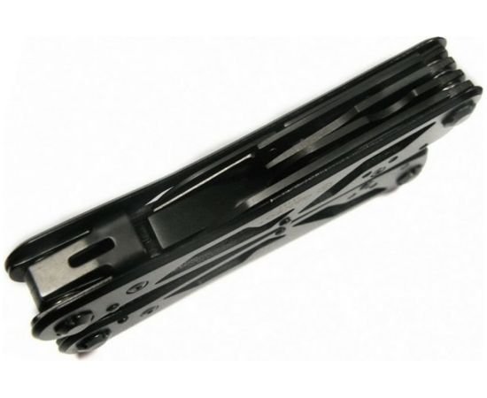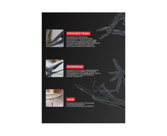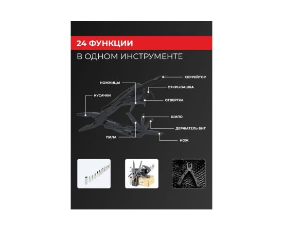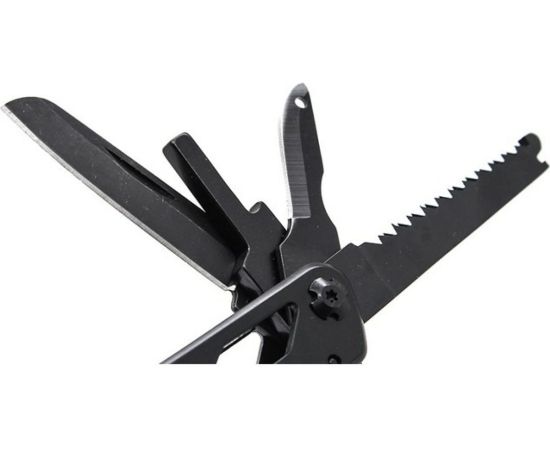 плоскогубцы,кусачки,маленькая отвертка плоская,нож,серрейтор,консервный нож,открывалка для бутылок,для снятии изоляции,пила,захват для гаек и цилиндров,ножницы,шило,держатель бит,12 сменных насадок