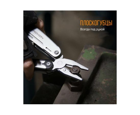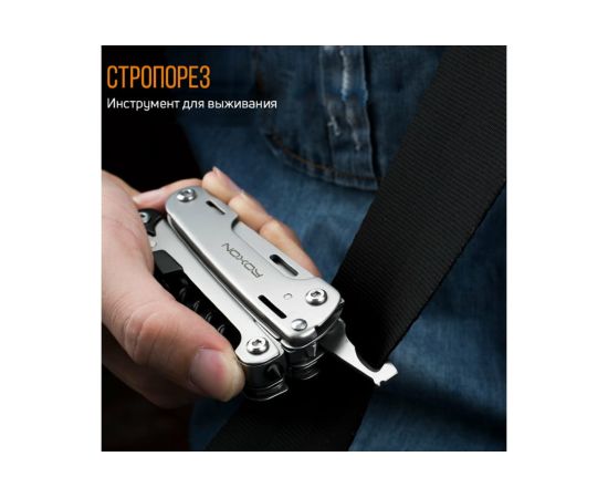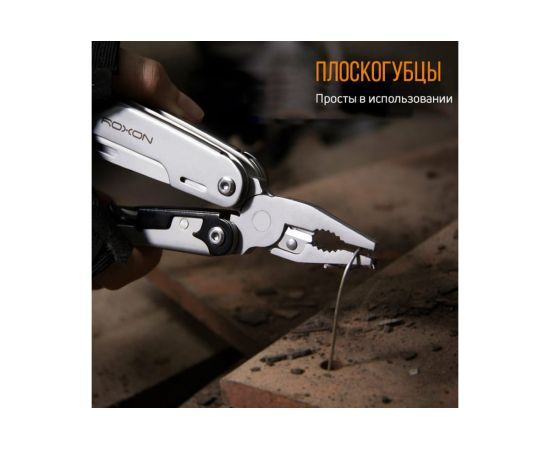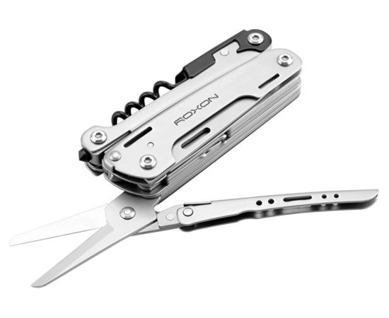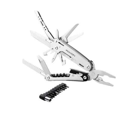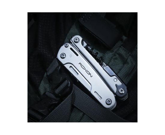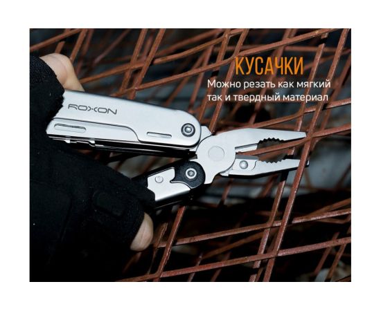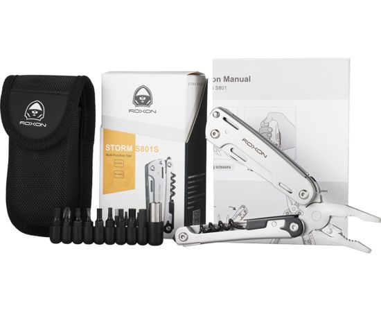 Модель Roxon STORM S801S создана по принципу классических мультитулов. Роль главного инструмента в нем выполняют плоскогубцы. Они дополнительно оснащены захватом для круглых предметов и функцией кусачек. Все остальные инструменты размещаются внутри двух металлических рукояток.