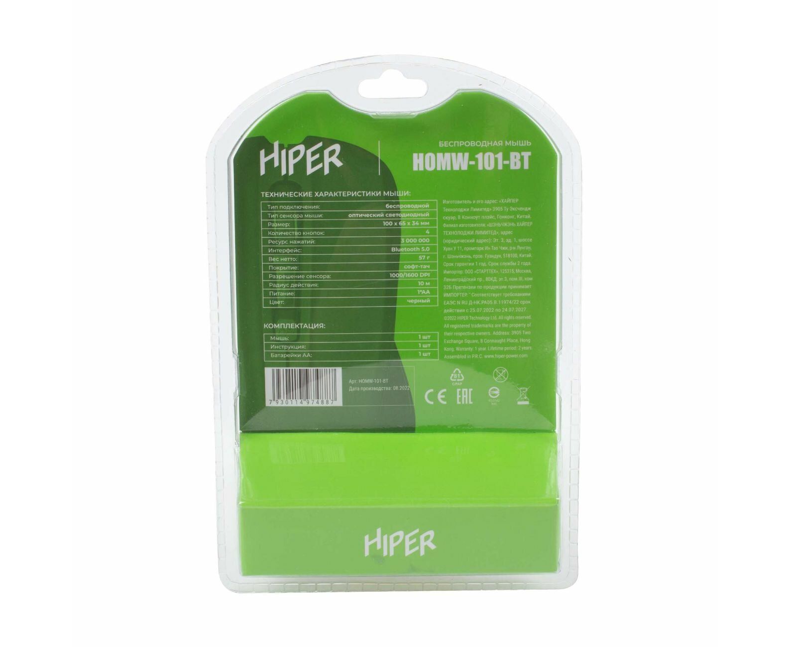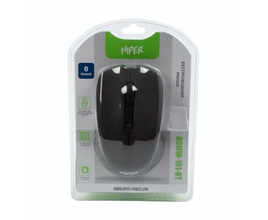 Беспроводная мышь Hiper HOMW-101-BT оптического типа весит 57 г. Устройство поддерживает Bluetooth, что обеспечивает дистанционную связь с компьютером на расстоянии до 10 м. Модель функционирует от батарейки АА, которая идет в наборе.