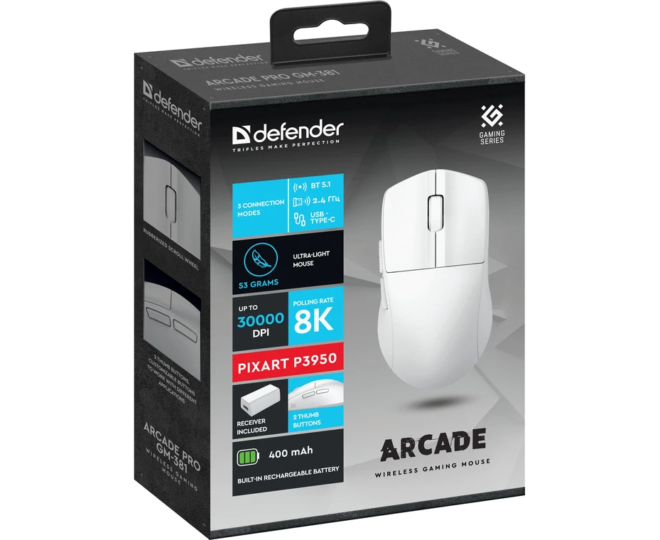 Мышь DEFENDER Arcade PRO GM-381 бел,8К,3в1,400мАч,6кн,30000dpi (52384)