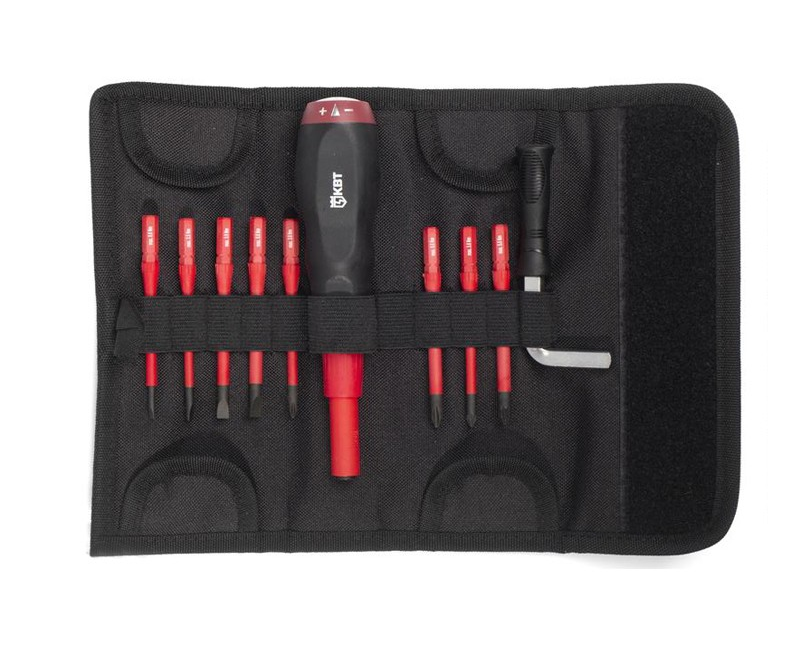 Набор диэлектрических динамометрических отверток применяется для проведения монтажных работ под напряжением до 1000 В. Усилие крутящего момента регулируется от 1 до 6 Нм. Стержни инструментов выполнены из прочной хром-ванадиевой стали. Инструменты поставляются в прочной раскладывающейся сумке с широкой застежкой-липучкой и петлей под ремень.